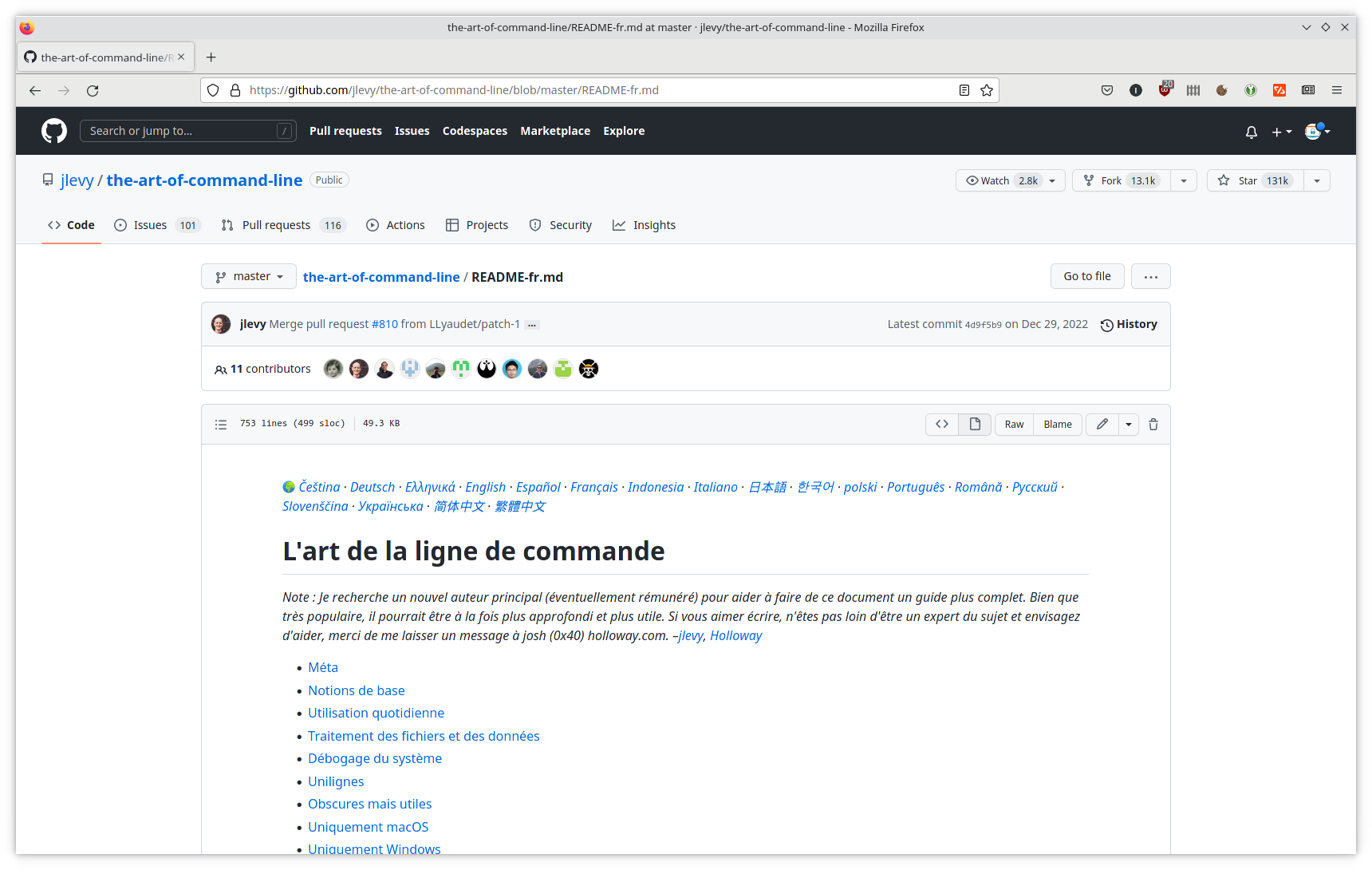 Au début de cette formation, vous avez créé un compte sur la plateforme GitLab. Il se trouve que le projet The Art Of Command Line existe également sur cette plateforme.
