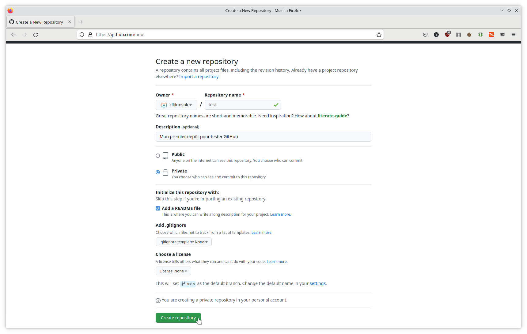 Cochez la case Add a README file si ce n'est déjà fait. Comme ça nous aurons quelque chose à nous mettre sous la dent, et nous pourrons tester le dépôt avec la commande