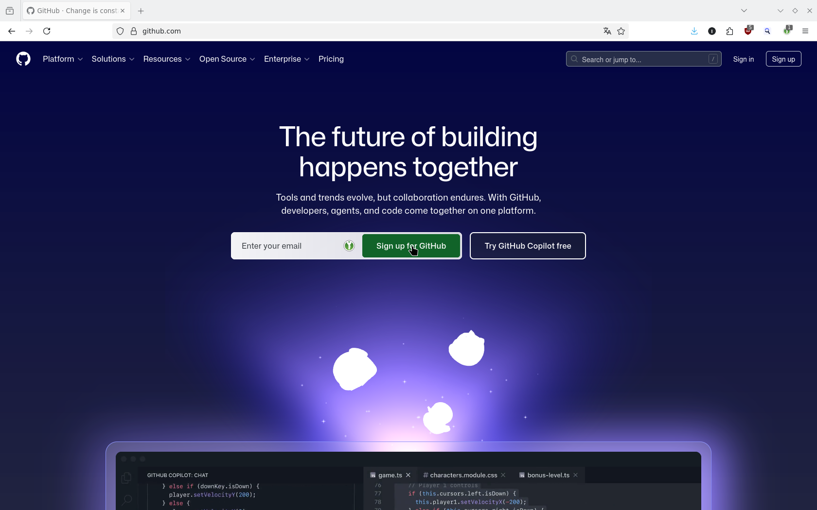 Si vous ne disposez pas déjà de compte sur la plateforme GitHub, c'est le moment d'en créer un. Oui, c'est gratuit. Non, il n'y a rien à payer. Saisissez votre adresse e-mail dans le champ d'inscription sur la page d'accueil et cliquez sur le bouton Sign-Up for GitHub :
