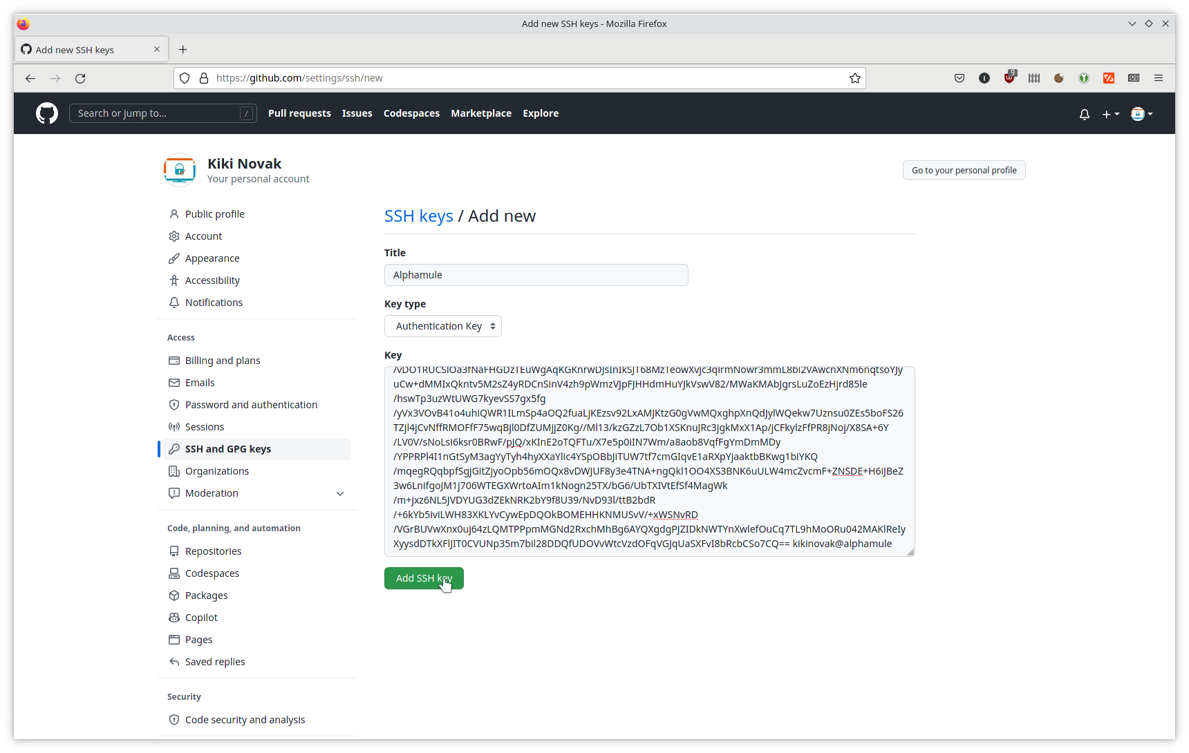 Si tout se passe bien, votre clé apparaît dans la rubrique Authentication Keys.