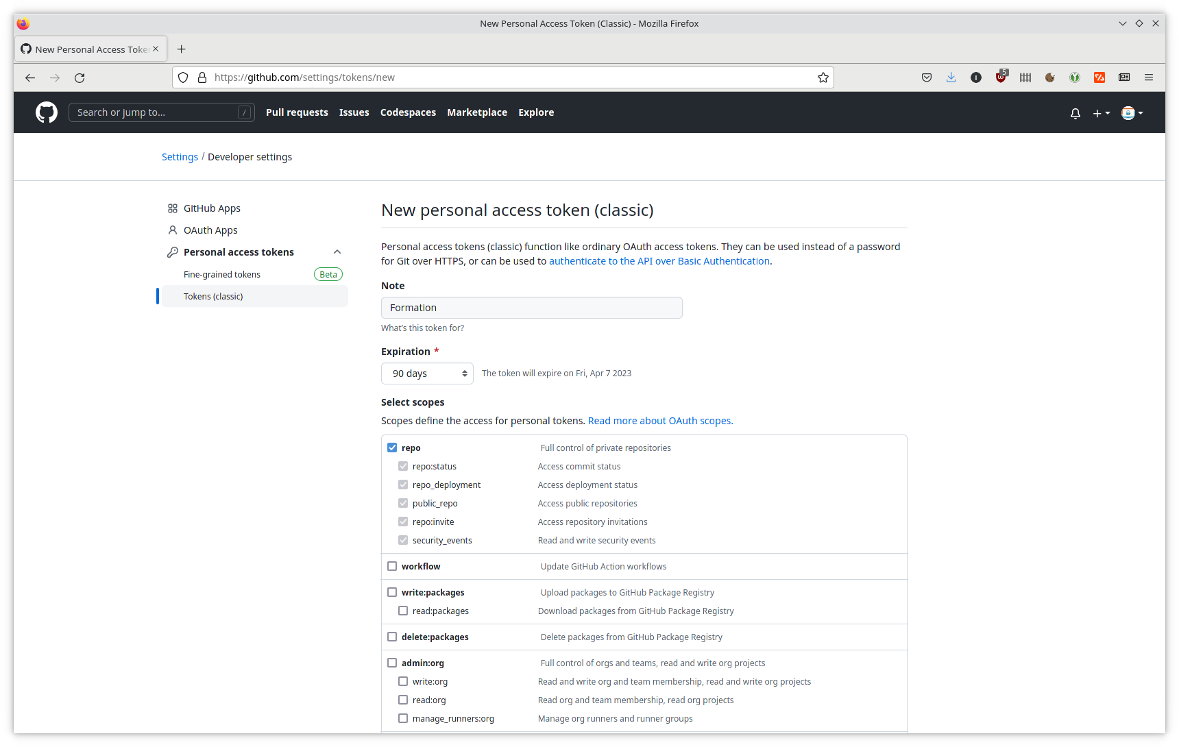 Dans un premier temps, autorisez l'accès aux dépôts en cochant Select scopes > repo.