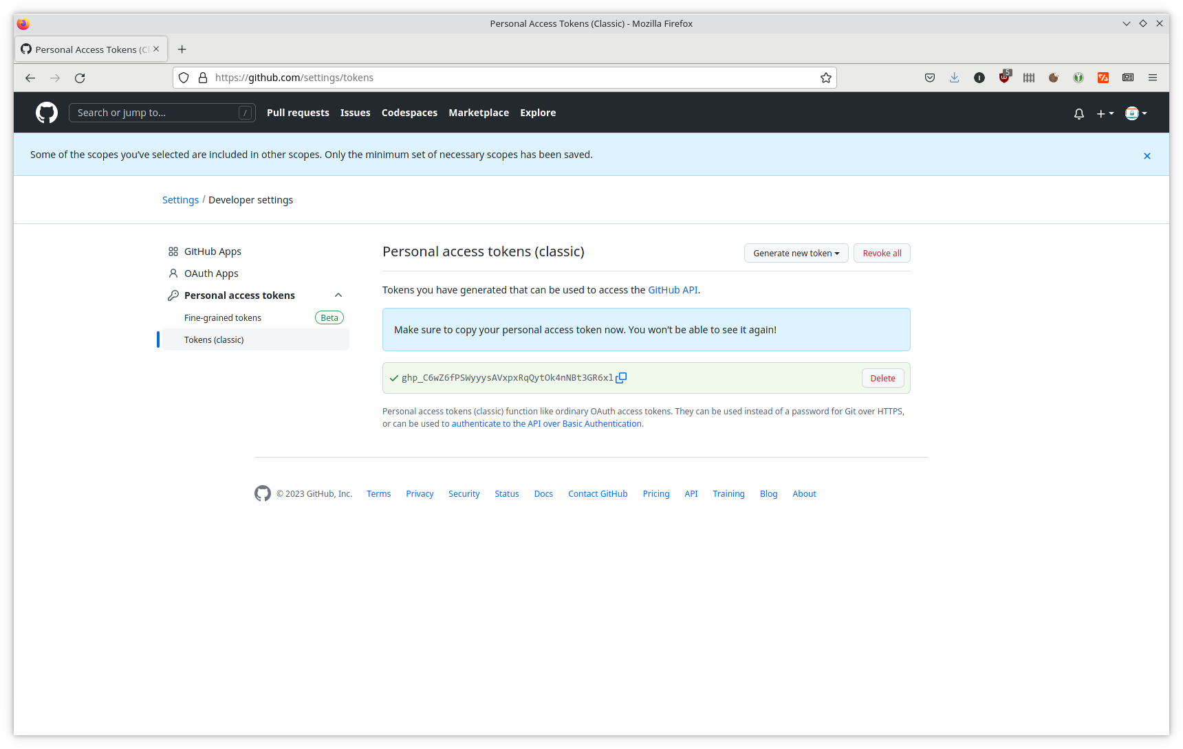 Vous pouvez copier/coller le token, l'enregistrer dans un fichier texte local ou (beaucoup mieux) un gestionnaire de mots de passe ou autre Credential Manager. Une fois que vous aurez quitté cette page, vous n'aurez plus aucun moyen de retrouver votre token, et si vous ne l'avez pas enregistré d'une manière ou d'une autre, il va falloir en générer un autre.