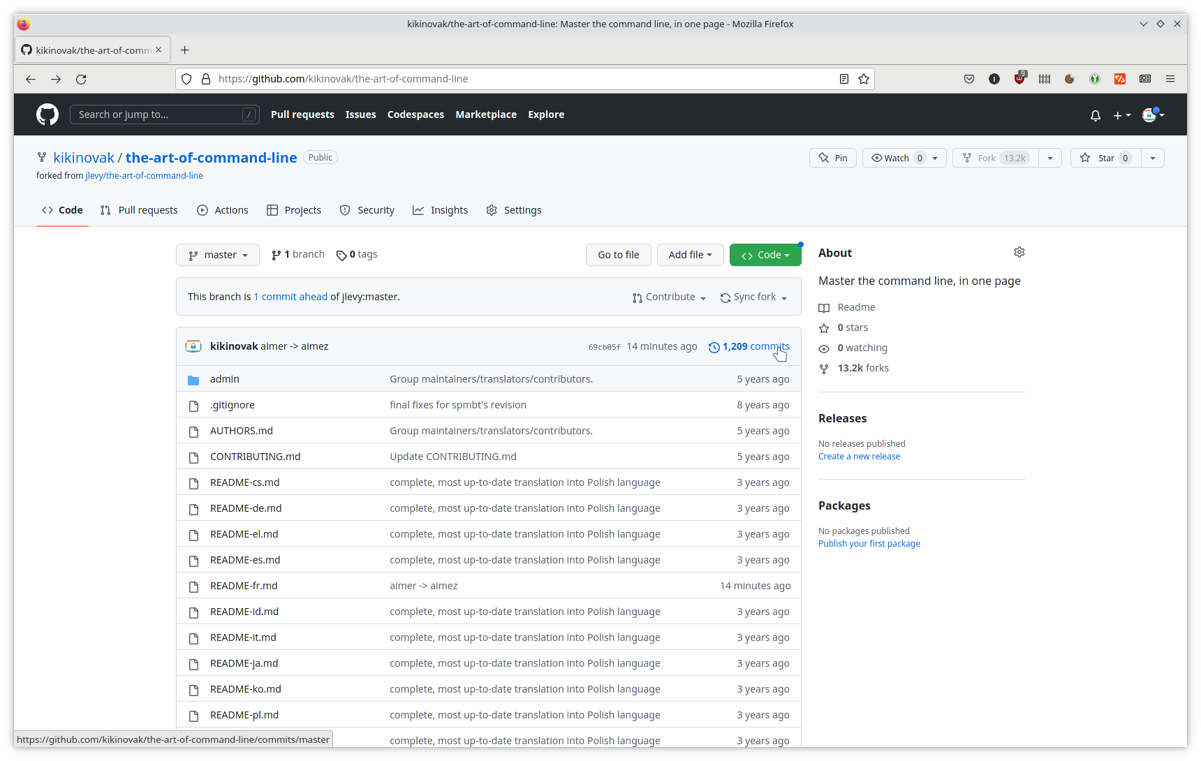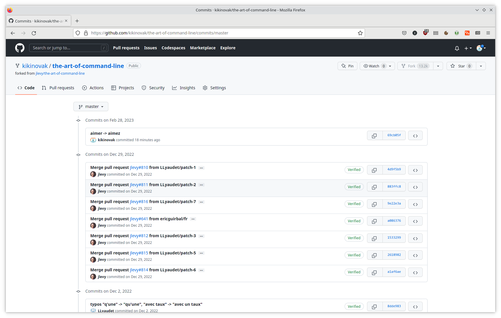 Si vous cliquez sur le nombre total de commits, l'historique s'affichera comme ceci :